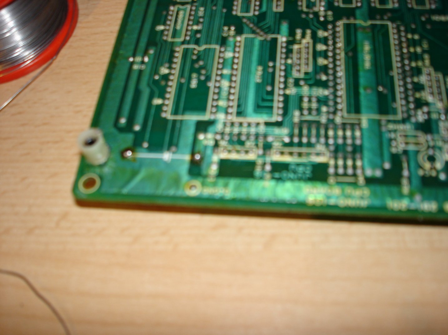 | This is the track side of the CPU board. A fine tip soldering iron is used to remove the remains of the old battery and clean up the solder ready for the new one | |